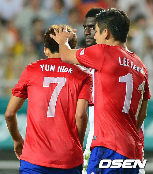 14일 오후 수원 월드컵경기장에서 열린 한국과 페루의 평가전 전반 윤일록의 슈팅이 빗나가자 이근호가 윤일록에게 격려를 보내고 있다.