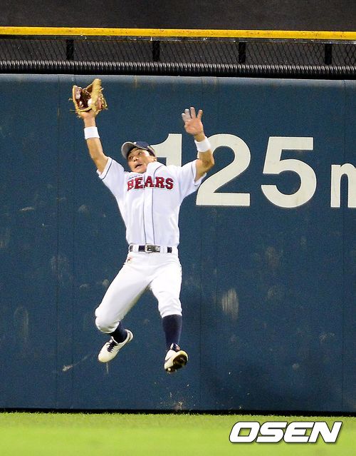 14일 오후 서울 잠실야구장에서 열린 '2013 한국야쿠르트 세븐 프로야구' 두산 베어스와 롯데 자이언츠의 경기, 5회초 2사 만루에서 두산 이종욱이 롯데 장성호의 안타성 타구를 몸 날려 잡아내고 있다.