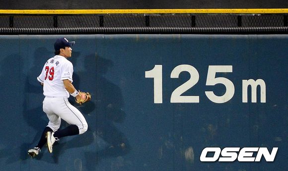 14일 오후 서울 잠실야구장에서 열린 '2013 한국야쿠르트 세븐 프로야구' 두산 베어스와 롯데 자이언츠의 경기, 5회초 2사 만루에서 두산 이종욱이 롯데 장성호의 안타성 타구를 몸 날려 잡아내고 있다.