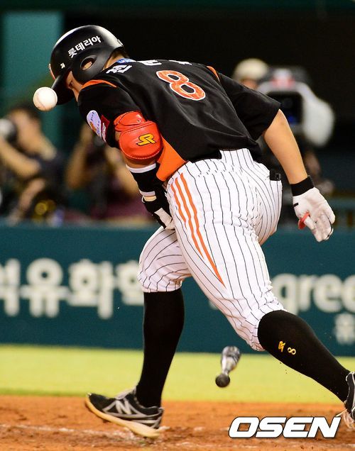14일 오후 서울 잠실야구장에서 열린 '2013 한국야쿠르트 세븐 프로야구' 두산 베어스와 롯데 자이언츠의 경기, 5회초 무사 1,2루에서 롯데 전준우가 번트를 하며 파울이 되고 있다. 이 과정에서 아웃을 선언했지만 파울로 번복 선언.