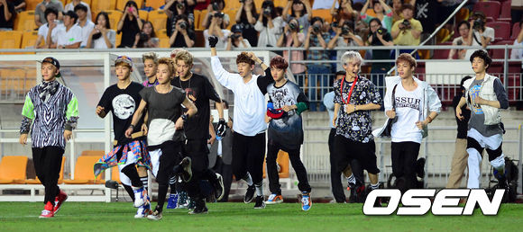 14일 오후 수원 월드컵경기장에서 열린 한국과 페루의 평가전 하프타임 EXO가 축하공연을 위해 그라운드에 나오고 있다.