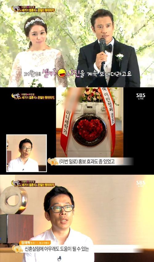 배우 이민정이 광고모델로 활동하고 있는 LG전자 측이 세탁기 화환을 결혼식 선물로 보낸 이유를 밝혔다.