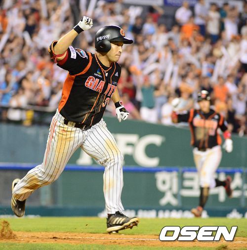 14일 오후 서울 잠실야구장에서 열린 '2013 한국야쿠르트 세븐 프로야구' 두산 베어스와 롯데 자이언츠의 경기, 8회초 2사 1,3루에서 롯데 손아섭이 역전 1타점 적시타를 날리고 기뻐하고 있다.