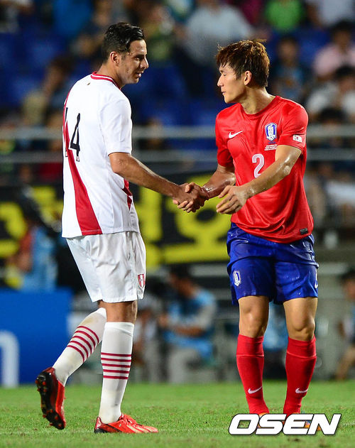 14일 오후 수원 월드컵경기장에서 열린 한국과 페루의 평가전 종료 후 피사로와 이용이 악수를 나누고 있다.