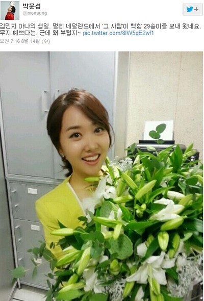 박문성 SBS 축구해설위원은 14일 자신의 트위터에 “김민지 아나운서의 생일. 멀리 네덜란드에서 '그 사람'이 백합 29송이를 보내 왔네요. 무지 예쁘다는. 근데 왜 부럽지~”라는 글과 함께 사진 한 장을 올렸다. 사진 속에서 김민지 아나운서는 꽃을 들고 환하게 웃고 있다.
