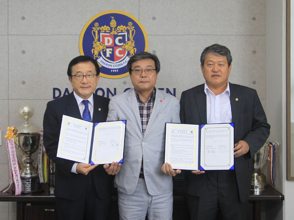 대전 시티즌은 지난 14일 오전 대전시티즌 사무국에서 업무협약식을 갖고 대전광역시의사회·대전지방변호사회는 지역 사회 공헌 및 나눔과 실천의 봉사활동을 위한 업무협약을 체결했다. 이 자리에는 대전광역시의사회 황인방 회장과 대전지방변호사회 문성식 회장, 대전시티즌 전종구 사장이 참석했다.