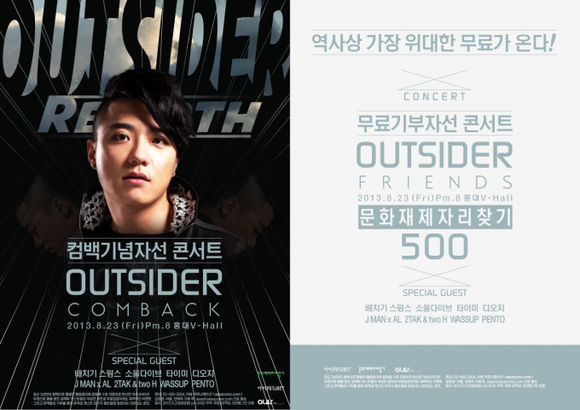 아웃사이더의 소속사인 아싸 커뮤니케이션(아싸컴즈) 측은 “이번 자선 단독 콘서트는 3년 만에 성공적으로 컴백한 아웃사이더의 음악에 많은 응원과 성원을 보내주신 여러분을 위한 선물로 선착순 500명 무료입장을 결정했다”며 “공연이 끝난 후 자유롭게 관람료를 내주시면 수익금 전액이 우리의 잃어버린 소중한 문화재 중의 하나인 '문정왕후 어보 반환 운동'에 기부될 예정이며, 공연 중간 아웃사이더와 힙합 음악을 사랑하는 팬 여러분을 위한 다양한 이벤트도 될 예정이니 많은 관심과 참여를 부탁드린다”고 전했다.