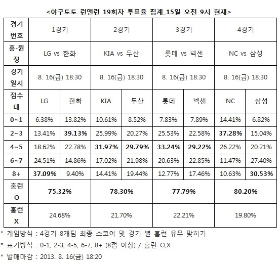 [야구토토] 국민체육진흥공단(www.kspo.or.kr)이 발행하는 체육진흥투표권 수탁사업자인 스포츠토토 공식 온라인 발매 사이트인 베트맨(www.betman.co.kr)이 오는 16일 오후 6시 30분부터 열리는 2013 국내프로야구(KBO) 4경기 8개 팀을 대상으로 한 야구토토 런앤런 19회차 투표율 중간집계 결과, 참가자들의 대다수인 75.32%는 LG-한화(1경기)전에서 홈런이 나올 것으로 예상했다고 밝혔다.
