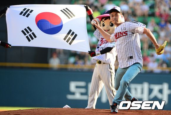 15일 오후 서울 잠실야구장에서 열린 '2013 한국야쿠르트 세븐 프로야구' LG 트윈스와 한화 이글스의 경기, 경기에 앞서 방송인 전현무가 시구를 하고 있다.