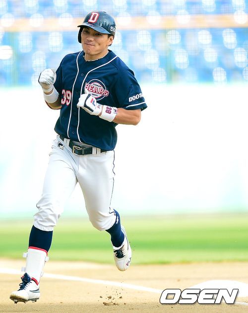 1회초 두산 공격 선두타자로 나선 1번타자 이종욱이 선제 우월 솔로포를 날리고 주먹을 불끈 쥐며 그라운드를 돌고 있다.