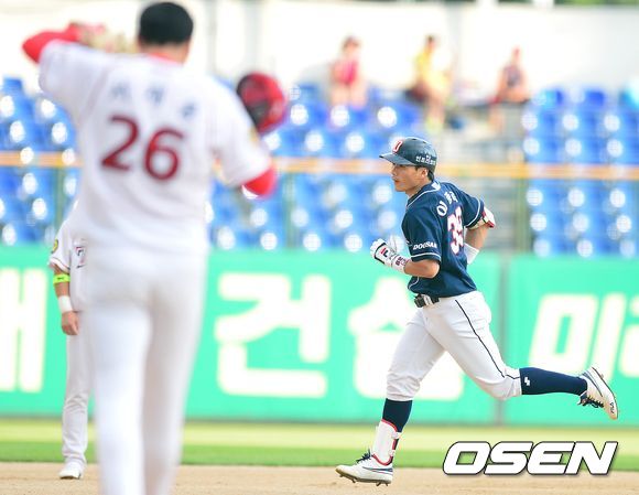 1회초 두산 공격 선두타자로 나선 1번타자 이종욱이 우월 선제 솔로포를 날리고 그라운드를 돌고 있다.