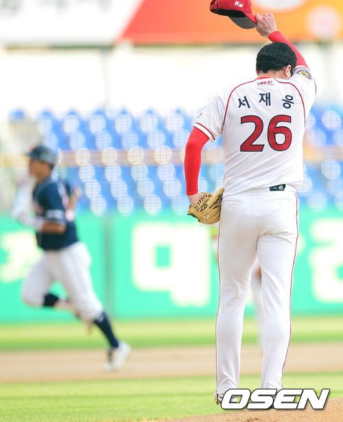1회초 두산 공격 선두타자로 나선 1번타자 이종욱에게 우월 선제 솔로포를 허용한 KIA 선발 서재응이 모자를 벗어 땀을 닦고 있다.