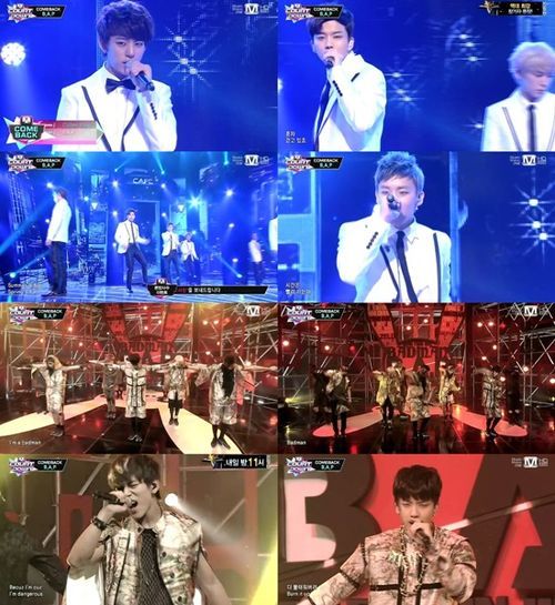 비에이피는 15일 오후 생방송된 엠넷 '엠카운트다운'에 출연, 세 번째 미니앨범의 수록곡 '커피숍(Coffee shop)'과 타이틀곡 '배드맨(Badman)'의 무대를 꾸몄다.