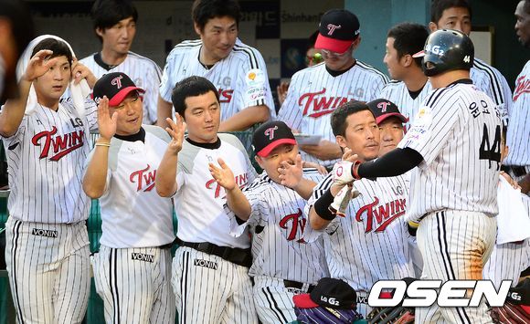 15일 오후 서울 잠실야구장에서 열린 '2013 한국야쿠르트 세븐 프로야구' LG 트윈스와 한화 이글스의 경기, 2회말 2사 2루에서 LG 박용택의 1타점 좌전 적시타에 윤요섭이 홈을 밟고 더그아웃에서 동료선수들과 하이파이브를 하고 있다.