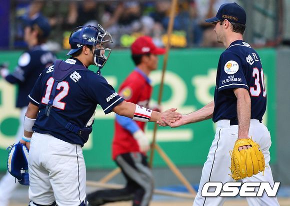 3회말 KIA 공격 2사 만루 상황, 3번타자 신종길을 2루수 직선타로 이끌며 무실점으로 이닝을 마무리지은 두산 선발 핸킨스와 포수 최재훈이 인사를 나누고 있다.