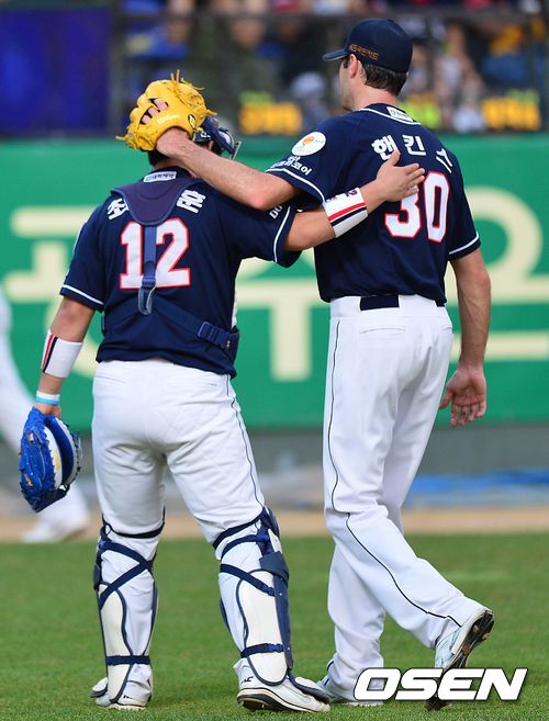 3회말 KIA 공격 2사 만루 상황, 3번타자 신종길을 2루수 직선타로 이끌며 무실점으로 이닝을 마무리지은 두산 선발 핸킨스와 포수 최재훈이 인사를 나누고 있다.
