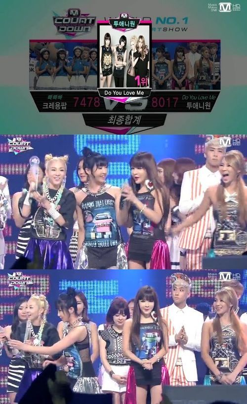 걸그룹 2NE1이 곡 '두 유 러브 미(Do you love me)'로 엠넷 '엠카운트다운'의 1위에 등극했다.