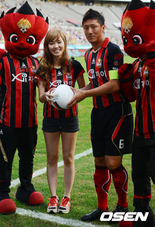 15일 오후 서울월드컵경기장에서 열린 현대오일뱅크 K리그 클래식 2013 23라운드 FC 서울과 대전 시티즌 경기, 시축을 마친 개그우먼 신보라가 서울 김진규와 포토타임을 갖고 있다.