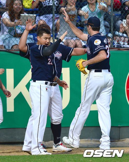 4회말 KIA 공격 1사 1루 상황, 6번타자 안치홍을 병살타로 이끌며 무실점으로 이닝을 마무리지은 두산 선발 핸킨스가 더그아웃으로 들어오며 홍성흔과 인사를 나누고 있다.