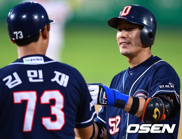 5회초 두산 공격 1사 3루 상황 9번타자 김재호가 1타점 적시 우전안타를 날리고 김민재 코치와 인사를 나누고 있다.