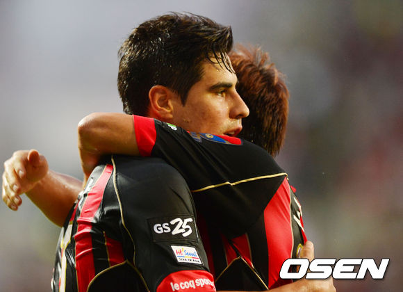 15일 오후 서울월드컵경기장에서 열린 현대오일뱅크 K리그 클래식 2013 23라운드 FC 서울과 대전 시티즌 경기, 전반 서울 몰리나가 선제골을 성공시킨 후 고요한과 포옹을 하고 있다.