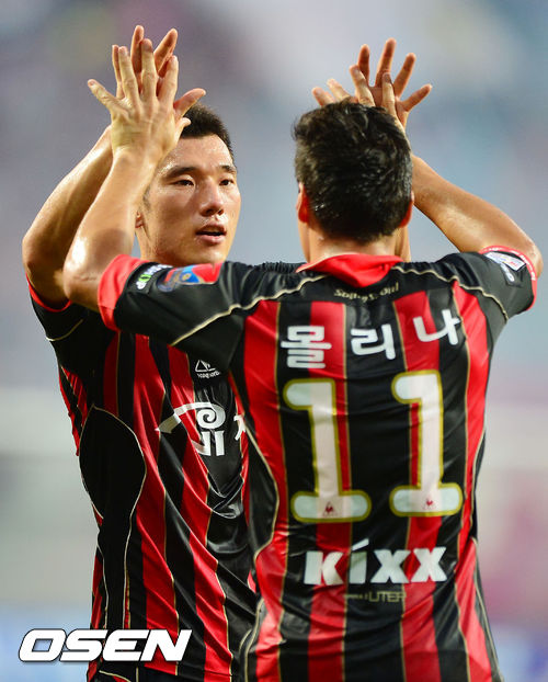 15일 오후 서울월드컵경기장에서 열린 현대오일뱅크 K리그 클래식 2013 23라운드 FC 서울과 대전 시티즌 경기, 전반 서울 몰리나가 선제골을 성공시킨 후 최효진과 하이파이브를 하고 있다.