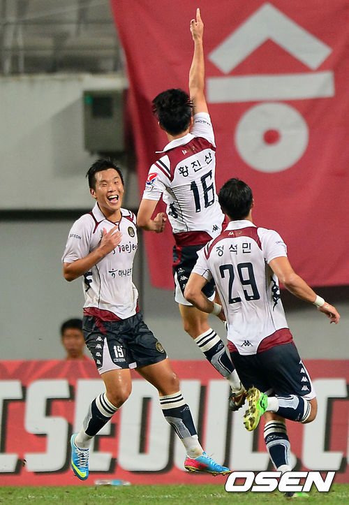 15일 오후 서울월드컵경기장에서 열린 현대오일뱅크 K리그 클래식 2013 23라운드 FC 서울과 대전 시티즌 경기, 후반 대전 황진산이 동점 골을 성공시킨 후 기뻐하고 있다.