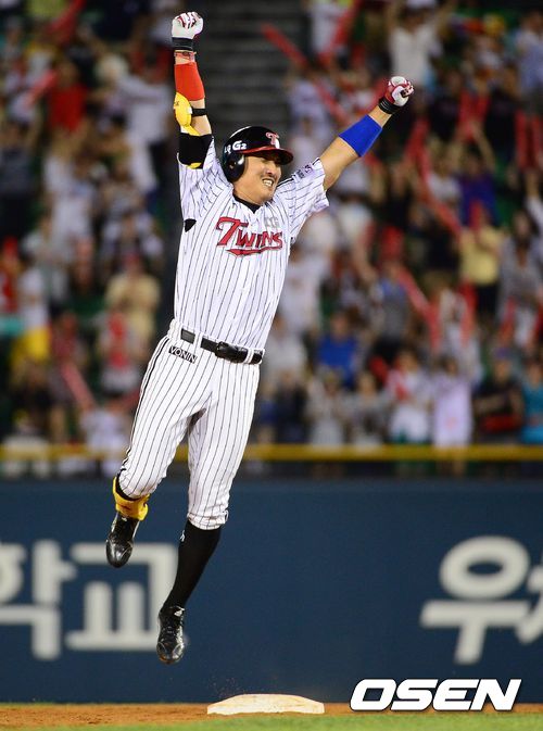 15일 오후 서울 잠실야구장에서 열린 '2013 한국야쿠르트 세븐 프로야구' LG 트윈스와 한화 이글스의 경기, 7회말 2사 1,2루에서 LG 이진영이 역전 2타점 적시 2루타를 날리고 기뻐하고 있다.