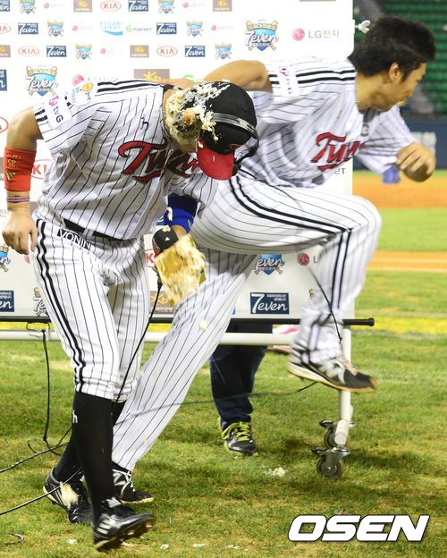경기후 LG 이진영 히어로 인터뷰에 이동현이 케이크를 얼굴에 묻히고 도망가고 있다./jpnews@osen.co.kr