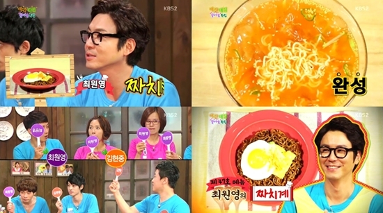 최원영은 15일 오후 방송된 KBS 2TV 예능프로그램 '해피투게더3' 꽃미남 야간매점 특집에 출연해 김현중의 '오라면'을 꺾고 메뉴등록에 성공했다.