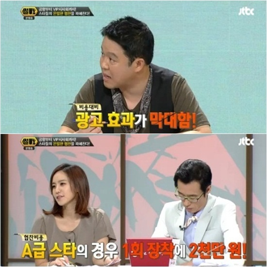 JTBC '썰전'이 연예인 협찬에 대해 '썰'을 풀으며 집중 공략했다. 김구라, 허지웅, 강용석, 박지윤 등이 밝힌 연예인 협찬의 뒷이야기는 시청자들의 눈길을 사로잡기 충분했다. 그 만큼 대중이 궁금해하는 자극적인 소재이기도 했다.