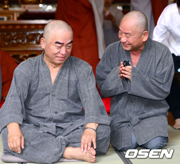 16일 오전 서울 종로구 견지동 조계사 일주문에서 진행된 연극 ' 그것은 목탁구멍 속의 작은 어둠이었습니다' 삭발식에서 배우 민경진과 이문수가 삭발후 담소를 나누고 있다