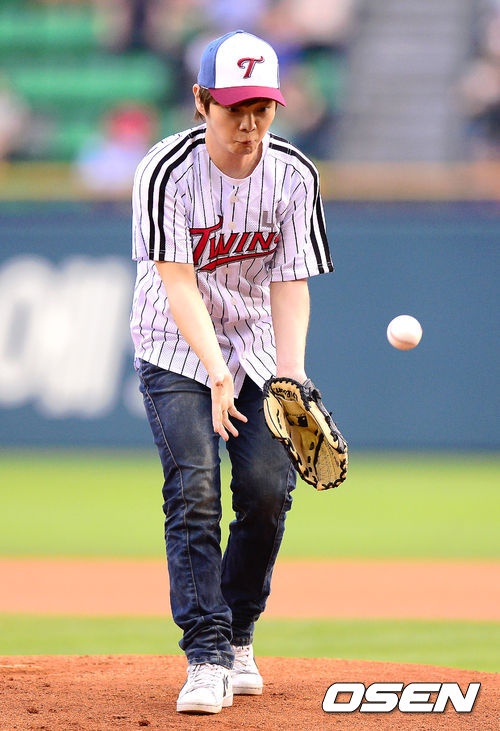 16일 오후 서울 잠실야구장에서 열린 '2013 한국야쿠르트 세븐 프로야구' LG 트윈스와 한화 이글스의 경기에 앞서 마술사 최현우가 시구를 하고 있다
