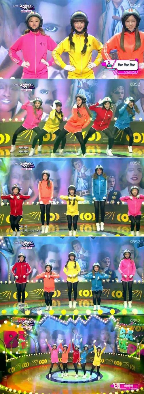 크레용팝은 16일 방송된 KBS 2TV '뮤직뱅크'에서 '빠빠빠' 무대를 펼쳤다. 멤버들은 5인 5색의 컬러로 나뉜 헬멧과 추리닝을 매치시켜 신나는 점핑 동작으로 눈길을 사로잡았다.