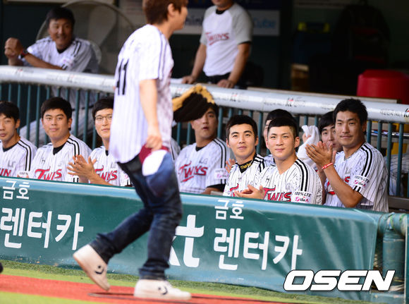 16일 오후 서울 잠실야구장에서 열린 '2013 한국야쿠르트 세븐 프로야구' LG 트윈스와 한화 이글스의 경기에 앞서 LG 선수들이 시구 마친 마술사 최현우를 바라보고 있다