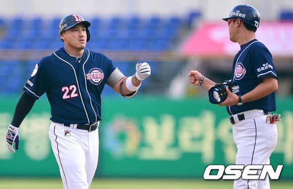 1회초 두산 공격 2사 1, 2루 상황 5번타자 홍성흔이 선제 1타점 중전 적시타를 날리고 김민재 코치와 인사를 나누고 있다.