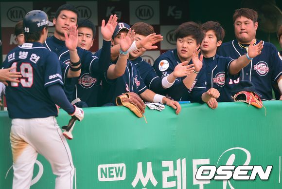 1회초 두산 공격 2사 1, 2루 상황 5번타자 홍성흔의 선제 1타점 중전 적시타 때 홈을 밟은 민병헌이 더그아웃 동료들과 인사를 나누고 있다.