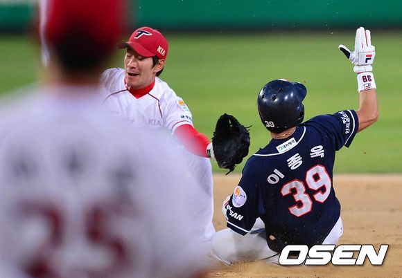 2회초 두산 공격 1사 1루 상황 주자 이종욱이 2루 도루에 성공하고 있다.