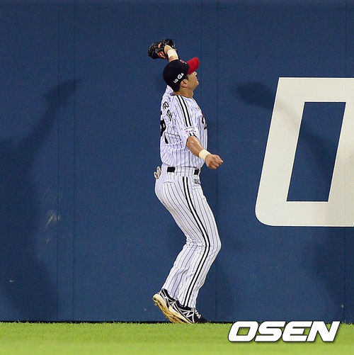 16일 오후 서울 잠실야구장에서 열린 '2013 한국야쿠르트 세븐 프로야구' LG 트윈스와 한화 이글스의 경기, 6회초 무사 1,2루 한화 김태균의 타구를 LG 박용택 중견수가 호수비 펼치며 잡아내고 있다