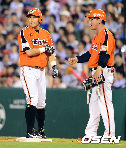 16일 오후 서울 잠실야구장에서 열린 '2013 한국야쿠르트 세븐 프로야구' LG 트윈스와 한화 이글스의 경기, 6회말 1사 1,2루 한화 이양기가 1타점 적시타를 날리고 강석천 코치와 하이파이브를 하고 있다