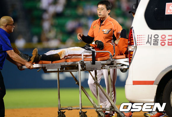 16일 오후 서울 잠실야구장에서 열린 '2013 한국야쿠르트 세븐 프로야구' LG 트윈스와 한화 이글스의 경기, 6회말 1사 1루 한화 엄태용의 안타때 3루로 달리던 추승우가 쓰러져 들것에 실려 엠뷸런스에 실리고 있다.
