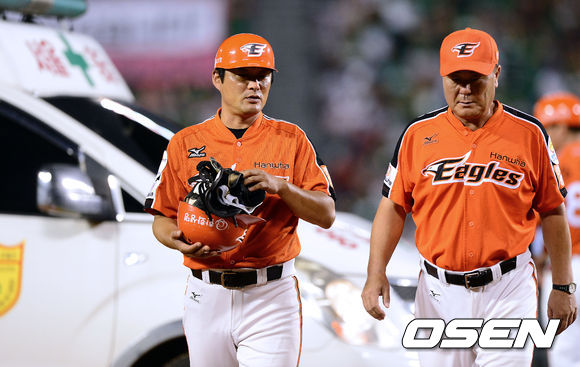 16일 오후 서울 잠실야구장에서 열린 '2013 한국야쿠르트 세븐 프로야구' LG 트윈스와 한화 이글스의 경기, 6회말 1사 1루 한화 엄태용의 안타때 3루로 달리던 추승우가 쓰러졌다. 이종범 코치와 김성한 코치가 그라운드에 올라와 추승우를 상태를 살피고 더그아웃으로 들어가고 있다