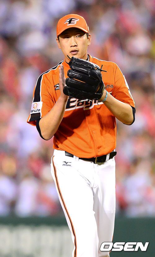 16일 오후 서울 잠실야구장에서 열린 '2013 한국야쿠르트 세븐 프로야구' LG 트윈스와 한화 이글스의 경기, 6회말 무사 1,3루에서 1실점만 허용한 한화 김혁민 투수가 이닝종료후 박수를 치며 더그아웃으로 들어가고 있다