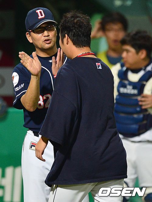 두산 김진욱 감독이 승리 투수가 된 유희관과 인사를 나누고 있다.