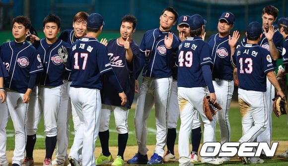 승리투수가 된 유희관을 비롯한 두산 선수들이 승리의 기쁨 속 하이파이브를 나누고 있다.