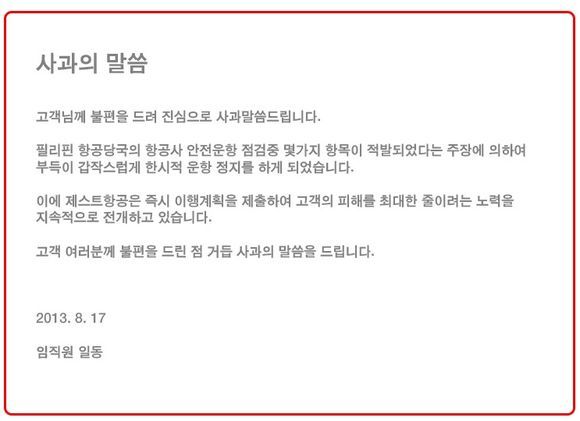 필리핀 저가 항공사인 제스트항공은 17일 자사 홈페이지를 통해 "필리핀 항공당국의 항공사 안전운항 점검 과정에서 몇 가지 문제점이 적발됐다는 주장에 의해 부득이 한시적으로 운항을 정지하게 됐다"고 공지했다.
