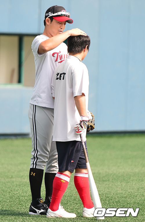 17일 오후 군상 월명야구장에서 열리는 '2013 한국야쿠르트 세븐 프로야구' KIA 타이거즈 대 LG 트윈스의 경기를 앞두고, LG 정의윤과 KIA 김선빈이 만나 인사를 나누며 장난을 치고 있다.