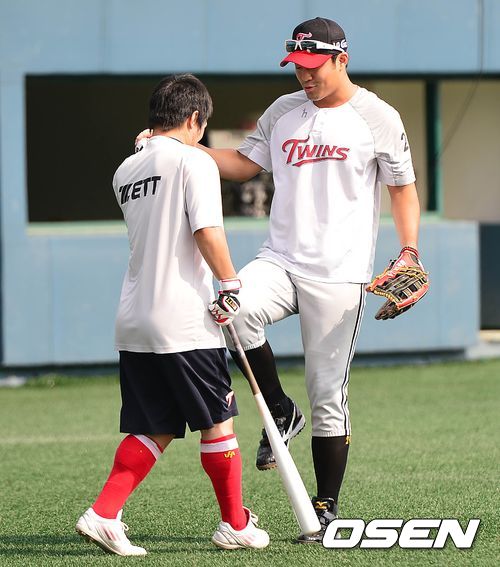 17일 오후 군상 월명야구장에서 열리는 '2013 한국야쿠르트 세븐 프로야구' KIA 타이거즈 대 LG 트윈스의 경기를 앞두고, LG 정의윤과 KIA 김선빈이 만나 인사를 나누며 장난을 치고 있다.