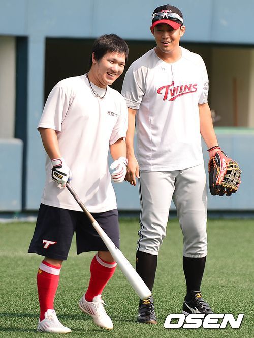 17일 오후 군상 월명야구장에서 열리는 '2013 한국야쿠르트 세븐 프로야구' KIA 타이거즈 대 LG 트윈스의 경기를 앞두고, LG 정의윤과 KIA 김선빈이 만나 인사를 나누고 있다.