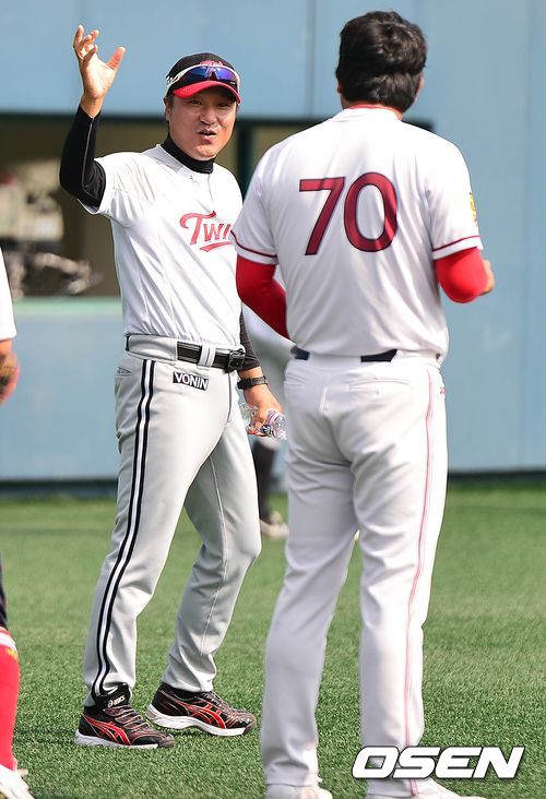 17일 오후 군상 월명야구장에서 열리는 '2013 한국야쿠르트 세븐 프로야구' KIA 타이거즈 대 LG 트윈스의 경기를 앞두고, LG 최태원 코치와 KIA 홍세완 코치가 인사를 나누고 있다.